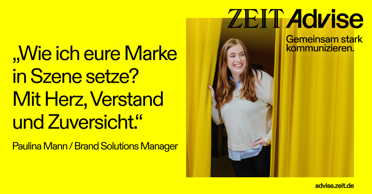 Willkommen bei ZEIT Advise, der Vermarktungseinheit der ZEIT Verlagsgruppe. Uns interessiert, was Sie bewegt. Und wen Sie bewegen möchten. Gemeinsam entwickeln wir kraftvolle Kommunikationslösungen, mit denen Sie Ihre Zielgruppe über alle Medienkanäle der ZEIT erreichen.