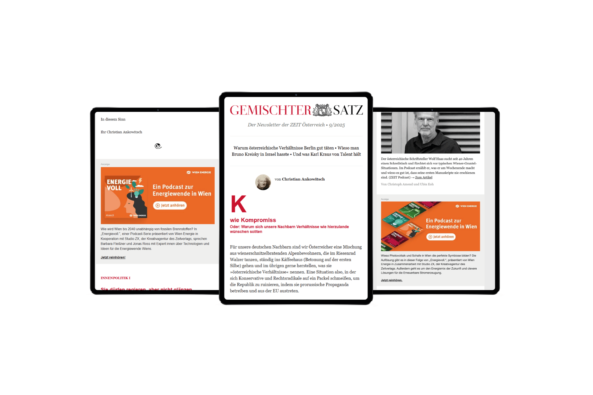 Begleitet wurde das Audioformat durch eine crossmediale Strategie: Eine 4-seitige Themenstrecke sowie Advertorials in der ZEIT Österreich geben journalistischen Kontext und vertiefen zentrale Inhalte. Display-Kampagnen auf zeit.de sowie Anzeigen im Newsletter »Gemischter Satz« führen gezielt zu den Folgen. Streifenanzeigen mit QR-Codes verbinden Print und Audio.