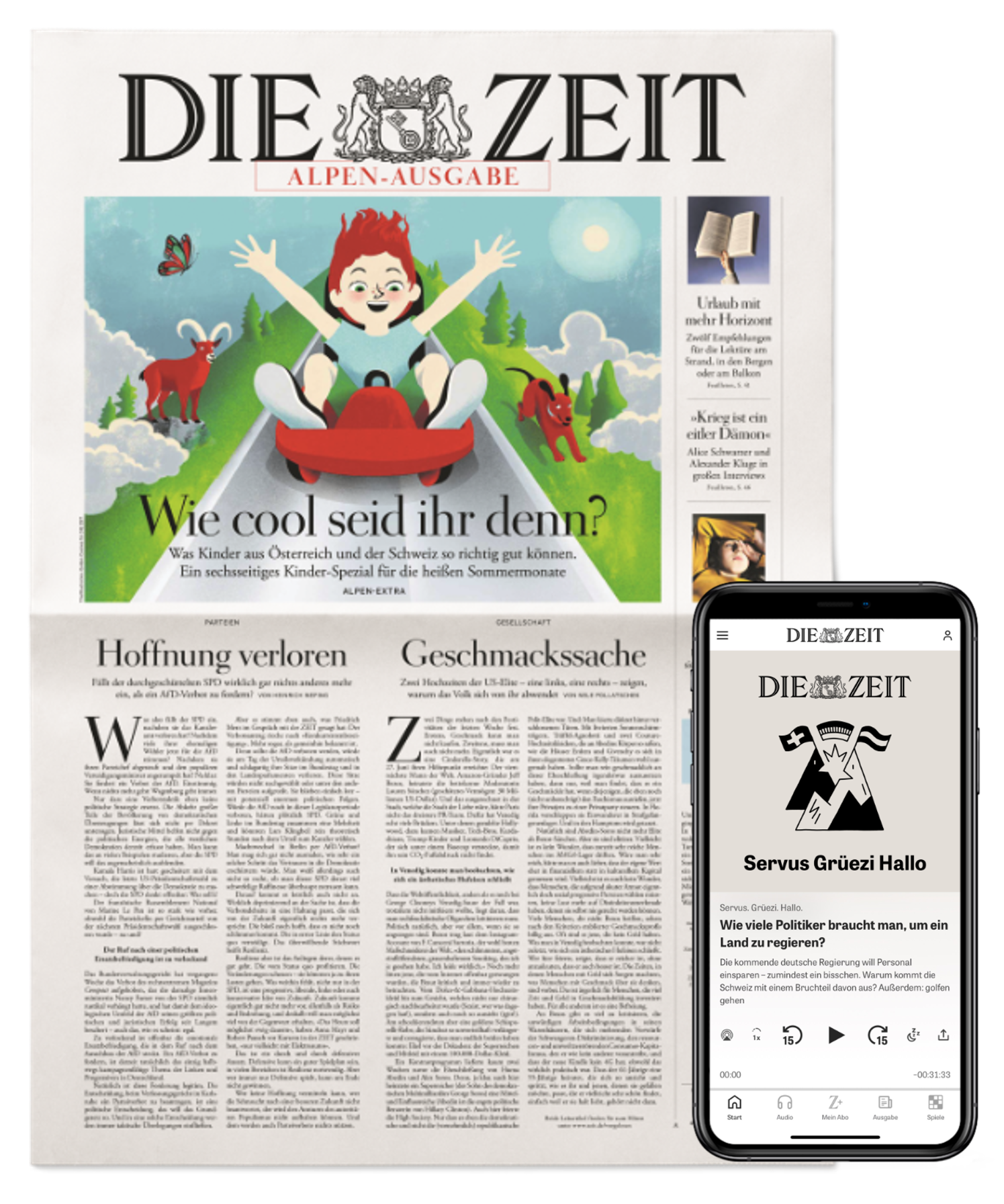 Das Beste aus drei Ländern vereint. In den sechs- bis zehn-seitigen Alpen-Ausgaben berichtet die ZEIT aus den drei Alpenländern Schweiz, Österreich und Deutschland. Im Fokus stehen wirtschaftliche, politische und soziale Themen, die alle drei Lebensräume charakterisieren und die dort lebenden Menschen beschäftigen.