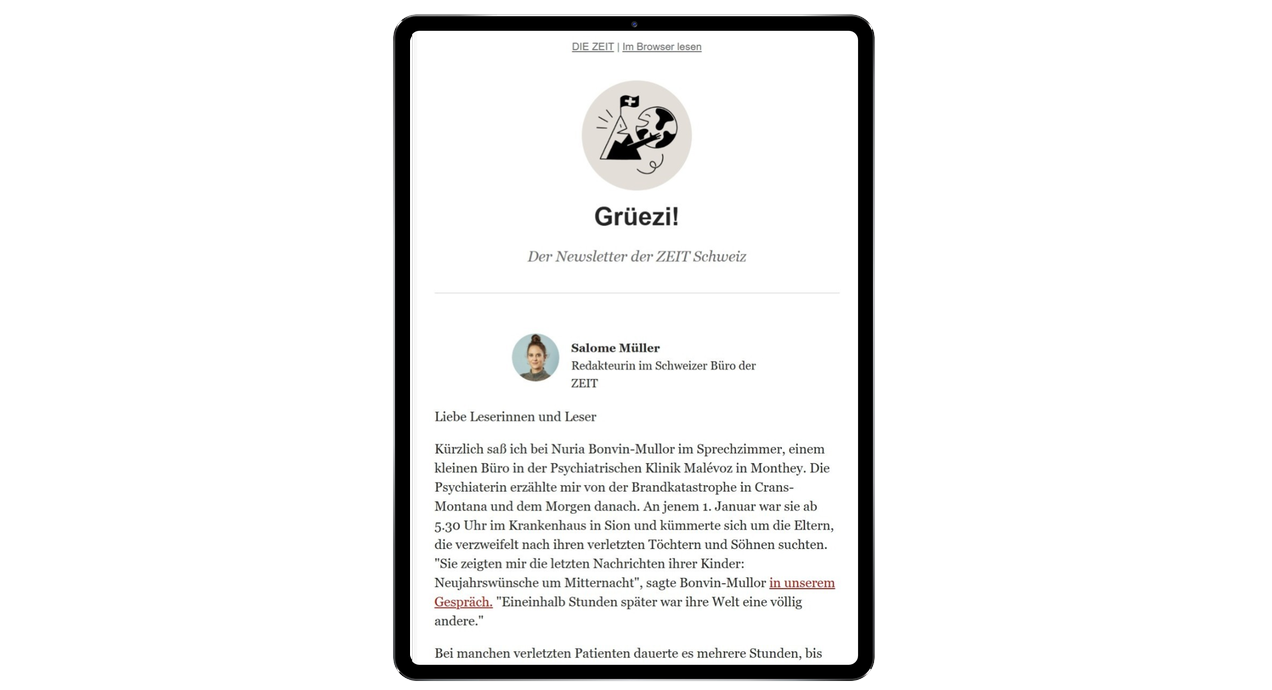 Unser neuer ZEIT Schweiz-Newsletter ist live: mit Expat-Ratgeber, Fotokolumne, dem Mundartwort der Woche und anderen spannenden Inhalten. Wir betrachten die Schweiz durch internationale Augen und fragen unsere Kolleginnen und Kollegen weltweit, wie sie die Schweiz sehen. „Grüezi!“ bringt frischen (Alpen)wind ins Postfach – und das jeden Freitag.