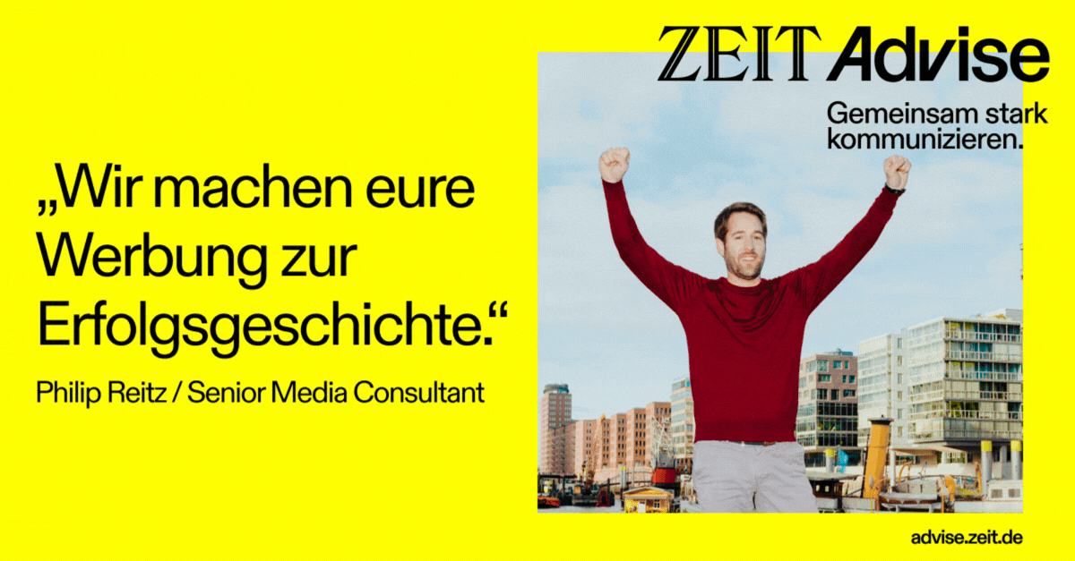 Was das für Ihre Kommunikation bedeutet? Als Partner von ZEIT Advise profitieren Sie nicht nur von reichweitenstarken Printmarken, sondern auch von der Glaubwürdigkeit und dem Vertrauen, das DIE ZEIT und ihre Angebote bei der Leserschaft genießen. Mit unserem Team aus rund 200 Expert:innen entwickeln wir individuelle Lösungen von der gedruckten Anzeige bis zu digitalen, audio- oder eventbasierten Formaten. So wird Ihre Botschaft passgenau platziert – mit hoher Relevanz, kanalübergreifend erzählt und nachhaltig wirksam.